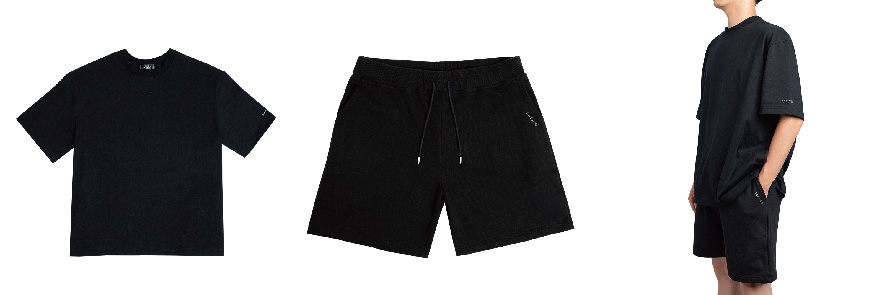 夏季款短袖上衣與短褲,使用高磅數純棉布,讓挺度與質感別樹一格。